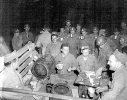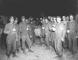 Troops of the 313th Engineer Combat Battalion enjoy coffee and donuts servered by the Red Cross. Italy May 1944. JPG - PDF